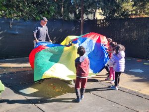 Fine and gross motor skills are the foundation of a child’s success inside and outside the classroom. Our activities develop these skills while having fun through play! Painting with watercolors during art time is a hands-on way for our students to practice grasping pencil-like objects while using their hand-eye coordination when painting within the lines of a picture. Using Play-Doh is another exciting craft our students enjoy, creating various creatures or shapes while strengthening the small muscles in their hands and fingers. Similarly, gross motor skills are habitually practiced throughout the school day. Through activities such as “pass the ball” and using our rainbow parachute our students use their gross motor skills to lift, pull, and throw.