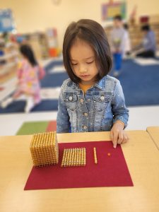 Montessori Golden Beads teaches mathematical concepts such as linear counting, place value, basic arithmetic, and the decimal system. Using the Montessori hands-on approach, these materials allow our young learners to count units from ones, tens, hundreds, and thousands. We use this strategy across our campuses, from Fremont to Hercules, Milpitas to Pleasant Hill, and across our many best-in-class preschool programs throughout the San Francisco Bay Area.