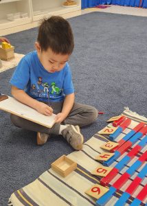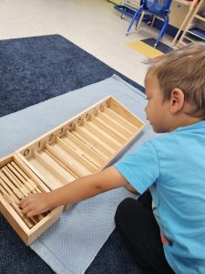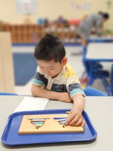 Another popular tool we use here at Learn And Play Montessori School is the bead stair. Sticking with the numbers one through nine, this instrument consists of nine segments of beads, each in a distinct color representing a number value. The first lesson instructed to our students with this tool is linear counting. Using the beads, the child can arrange each segment into a triangle by correctly counting one through nine. Following the Montessori Method, allowing the child to start this exercise on their own, gives the child the power to recognize if they made any errors by simply seeing if the triangle has been properly formed. Later in their academic journey, the students may use bead segments to assist them in multiplying numbers.